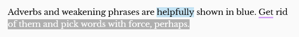 Adverb usage: The editor will highlight excessive adverb usage in BLUE and suggest alternatives.