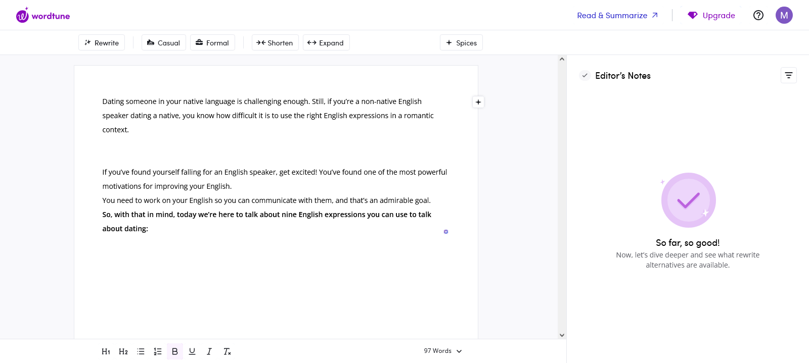 Wordtune can be a helpful learning tool for improving your understanding of the language and learning from the recommendations provided.