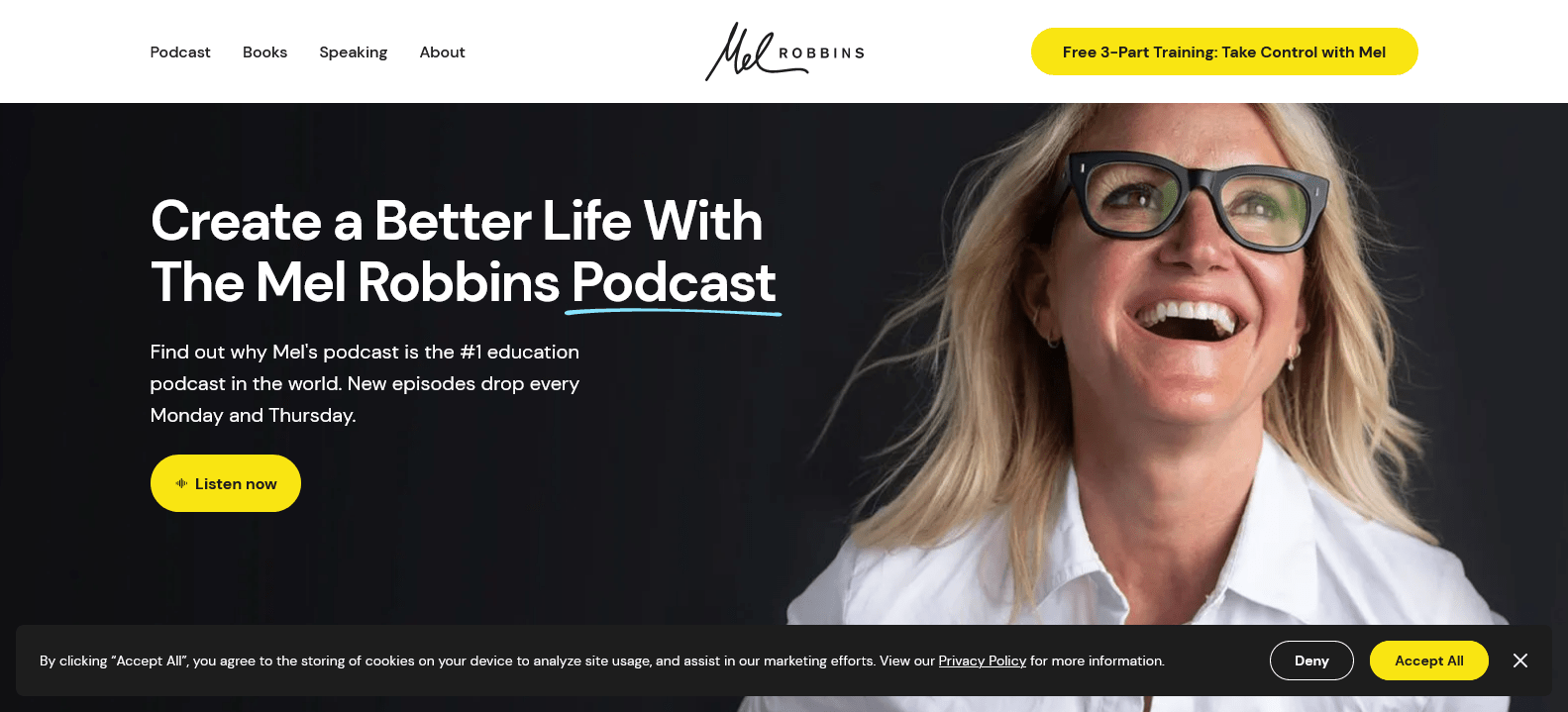 Mel Robbins is a speaker and author known for her book “The 5 Second Rule.” She focuses on helping people overcome self-doubt and procrastination.